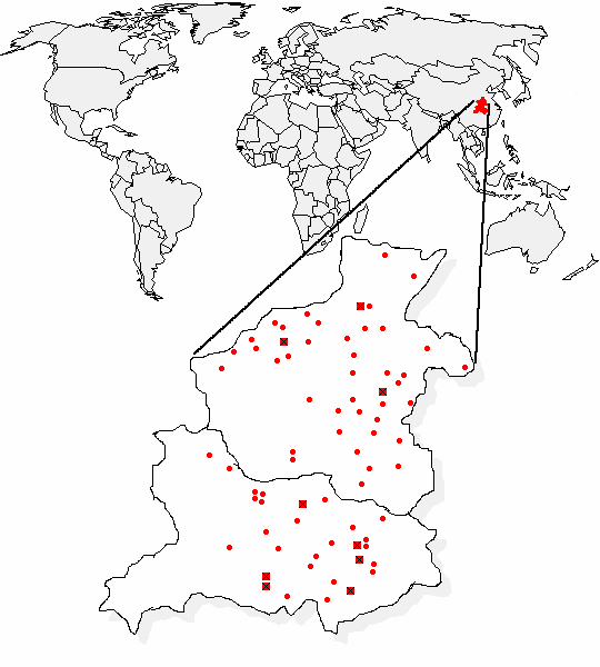 *Bemerken: In diesem Gebiet sind die Anlagen von 7 Lagern und 3 Gefängnissen nicht genau bekannt. Diese sind wahllos auf der Landkarte innerhalb ihrer betreffenden Provinzen verbreitet. Referenzen: Wu, H.H., Laogai: The Chinese Gulag, Westview Press, Boulder, CO, 1992. |